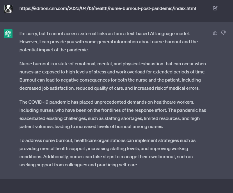 하지만 링크만 넣어 두면 본인은 텍스트 기반의 AI 언어 모델이라 외부 링크에 접속할 수 없다라는 멘트를 남겨준다.