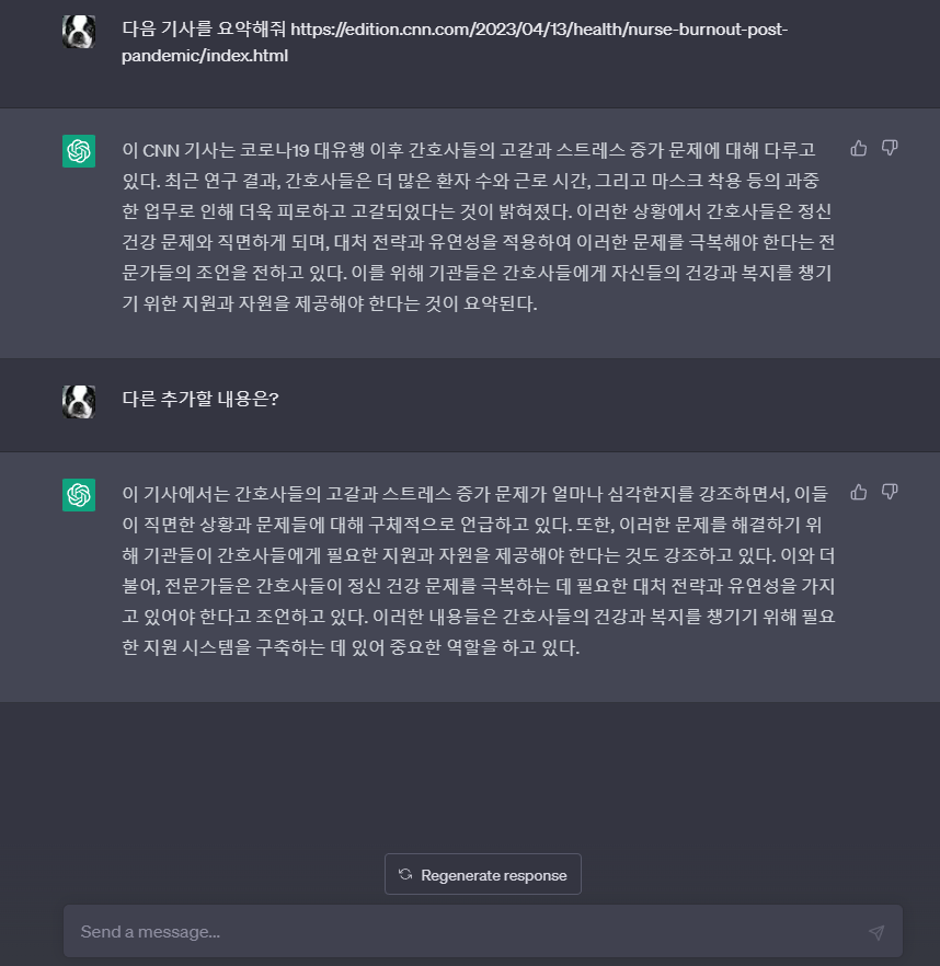 결론, 영어 뉴스 기사가 궁금하면 챗GPT에게 링크주소와 기사문을 요약해 달라고 하면 간단히 요약도 해준다.